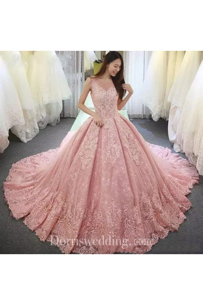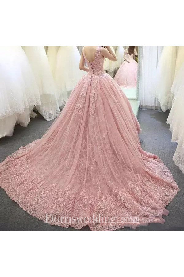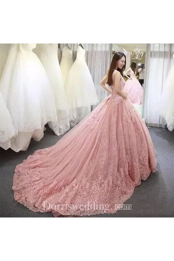 V-neck Illusion 3 4 Length Sleeve Sweep Train Lace Tulle Ball Gown Wedding Dress