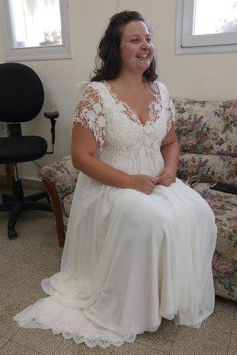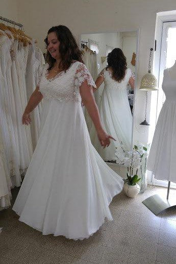 V-Neck Short Sleeve Lace Chiffon Plus Size Wedding Dress