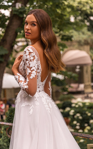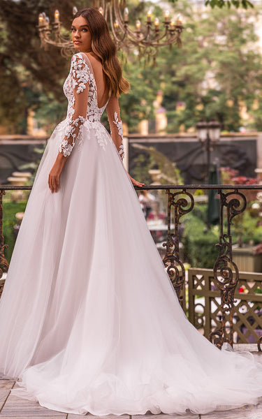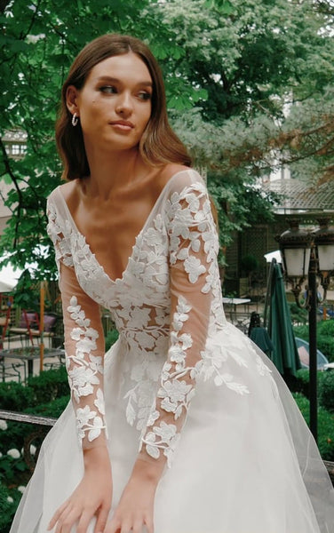 Vintage A Line Ball Gown Floor-length Court Train Lace Tulle V-neck Long Sleeve Wedding Dress-716040
