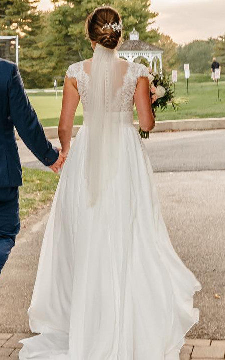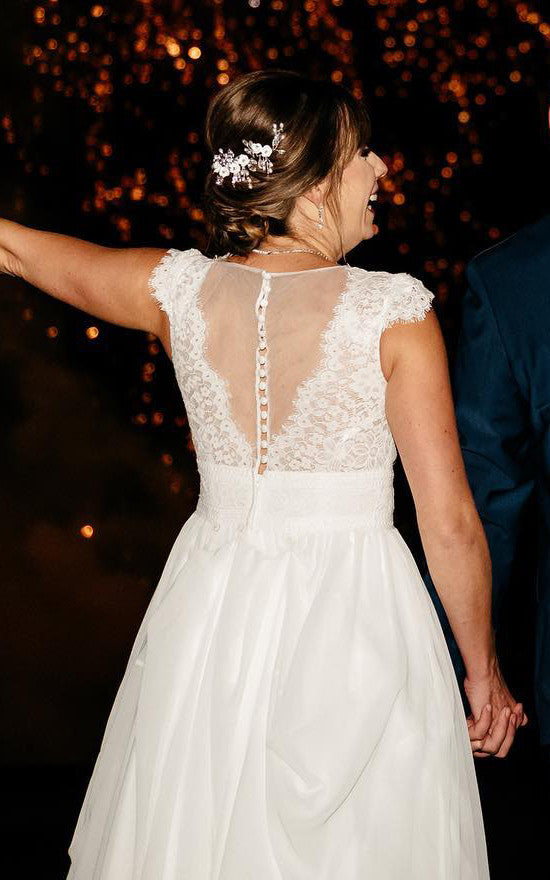 The Vintage Beach Country A-Line Plus Size Boho Lace Wedding Dress Modest Elegant V-Neck Illusion Back Cap Sleeve Chiffon Bridal Gown is evocative, to say the least, but that's why you're drawn to it in the first place.
