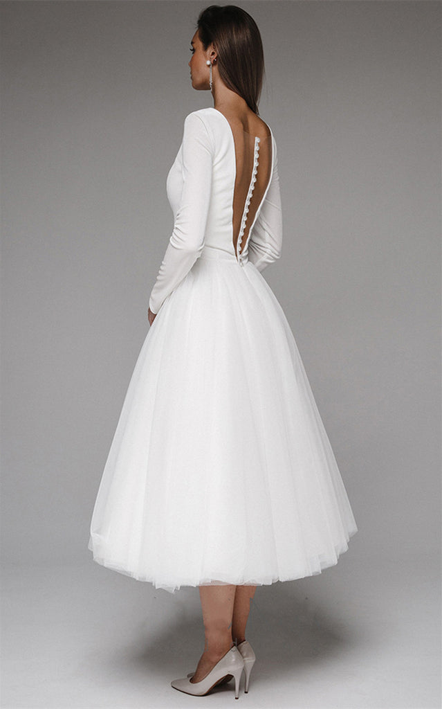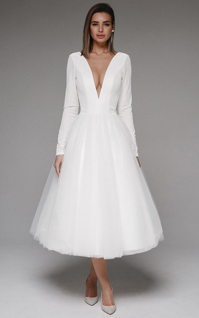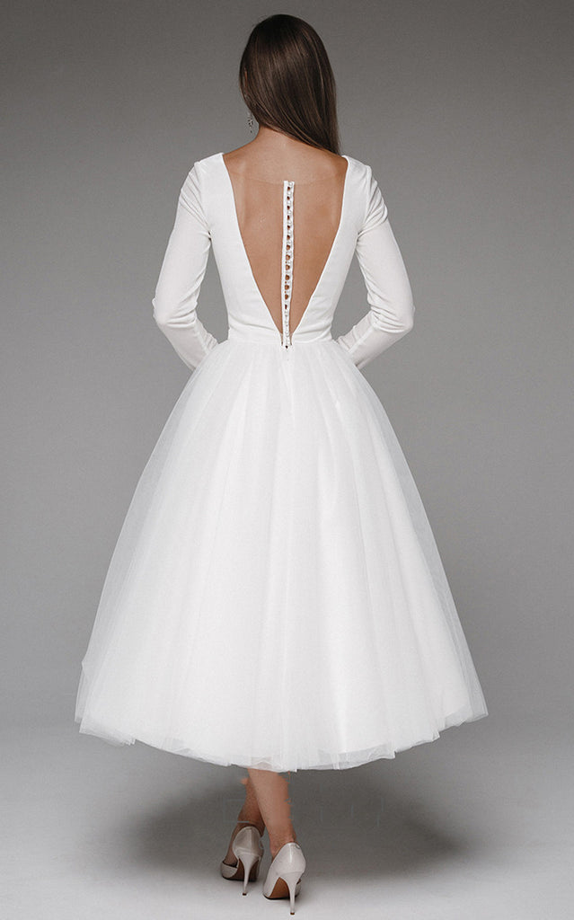 Vintage Tea-length A Line Plunging Neckline Satin Tulle Wedding Dress-716388