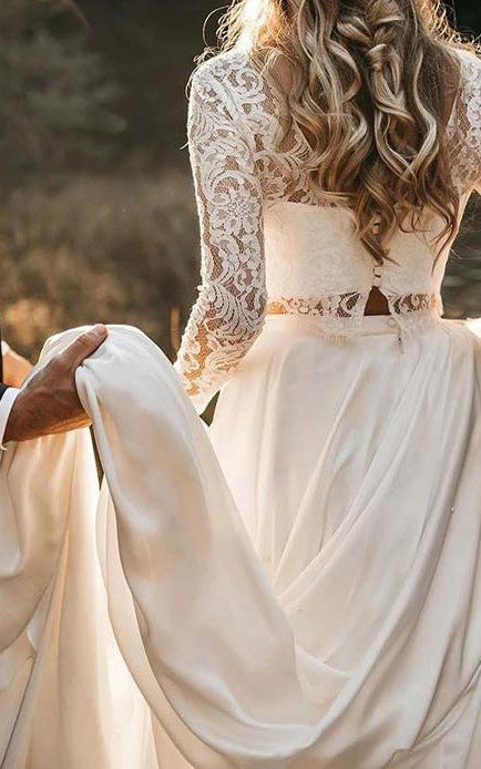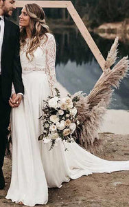 Country Boho Two Piece Chiffon Lace Bateau Long Sleeve Wedding Dress with Pleats-716013