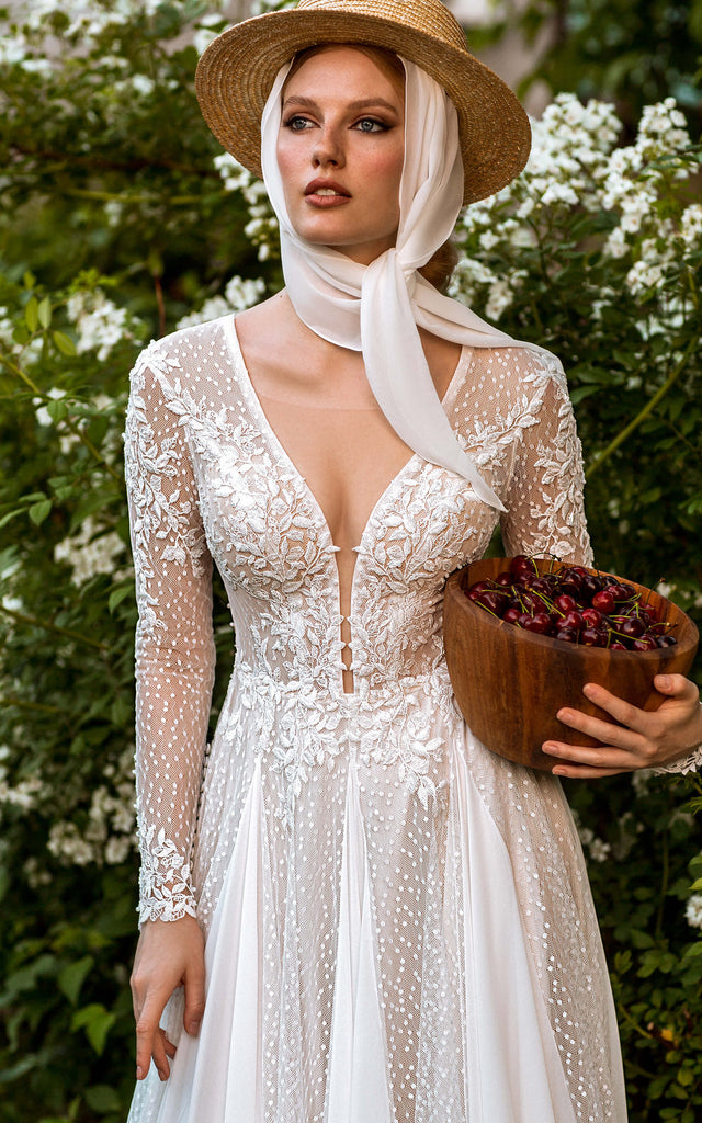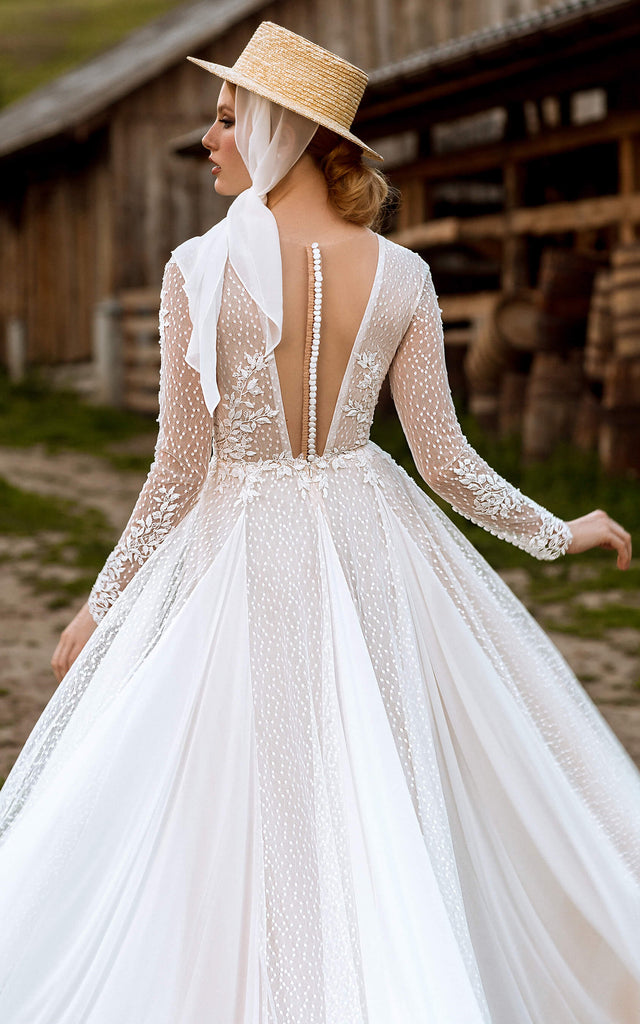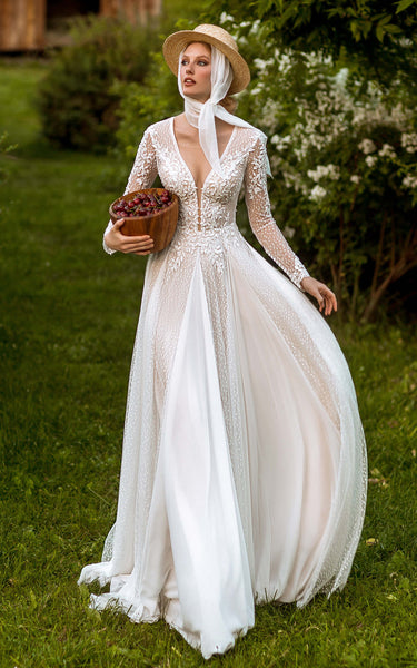 Western Country Garden Floral Boho Lace Wedding Dress Romantic Floor Length Plunging Neckline Bridal Gown with Button Back