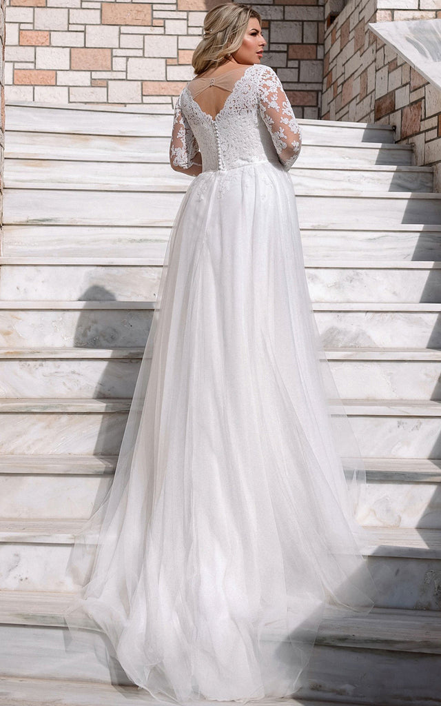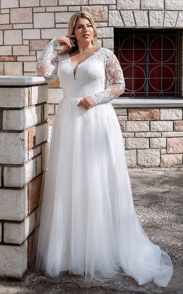 Western Sexy Plus Size A-Line Boho Lace Wedding Dress with Sleeves Modern Gorgeous Floor Length Tulle Gown with Appliques and Sweep Train