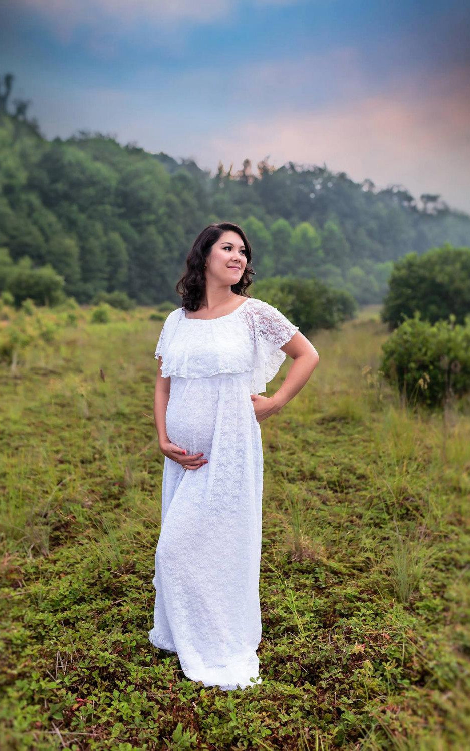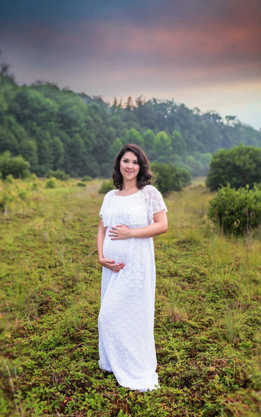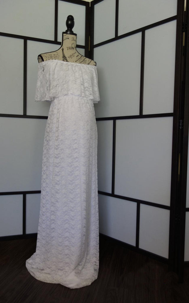 White Flutter Top Pregnant A-Line Vintage Lace Gown-712074